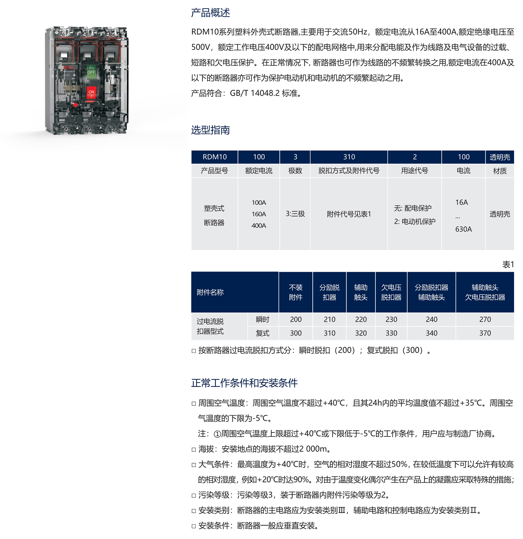 RDM10系列塑料外壳式断路器,主要用于交流50Hz,额定电流从16A至400A,额定绝缘电压至500V,额定工作电压400V及以下的配电网格中,用来分配电能及作为线路及电气设备的过载、短路和欠电压?;ぁT谡G榭鱿? 断路器也可作为线路的不频繁转换之用,额定电流在400A及以下的断路器亦可作为?;さ缍偷缍牟黄捣逼鸲谩? 产品符合:GB/T 14048.2 标准。