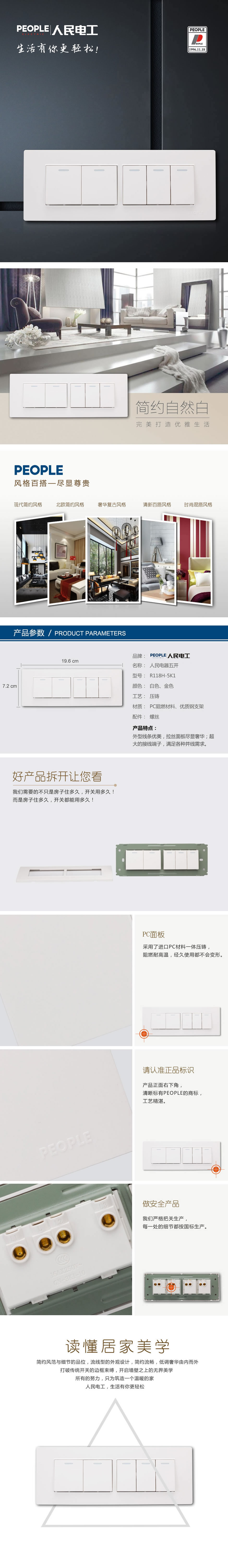 型号:R118H-5K1(单控)、R118H-5K2(双控) 五联开关;颜色:白色,金色