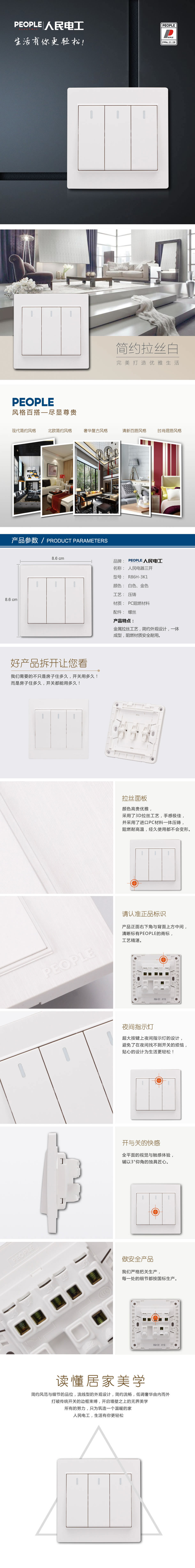 型号:R86H-3K1(单控)、R86H-3K2(双控) 三联开关;颜色:白色、金色