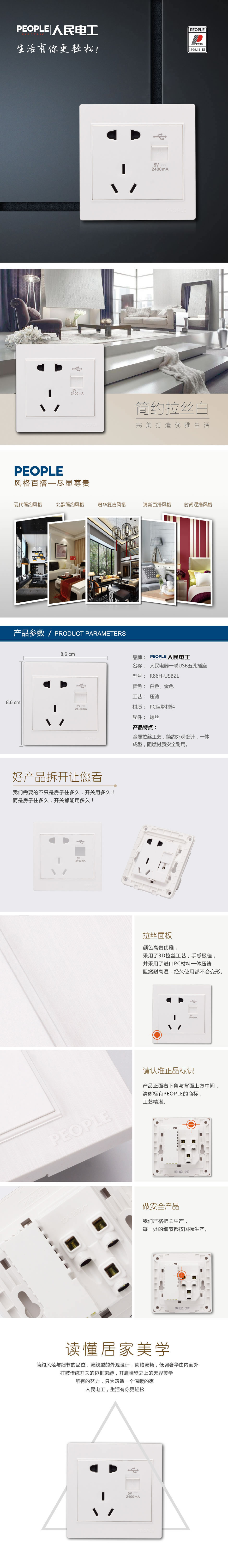 型号:R86H-WUSBZL 一联USB五孔插座;颜色:白色、金色
