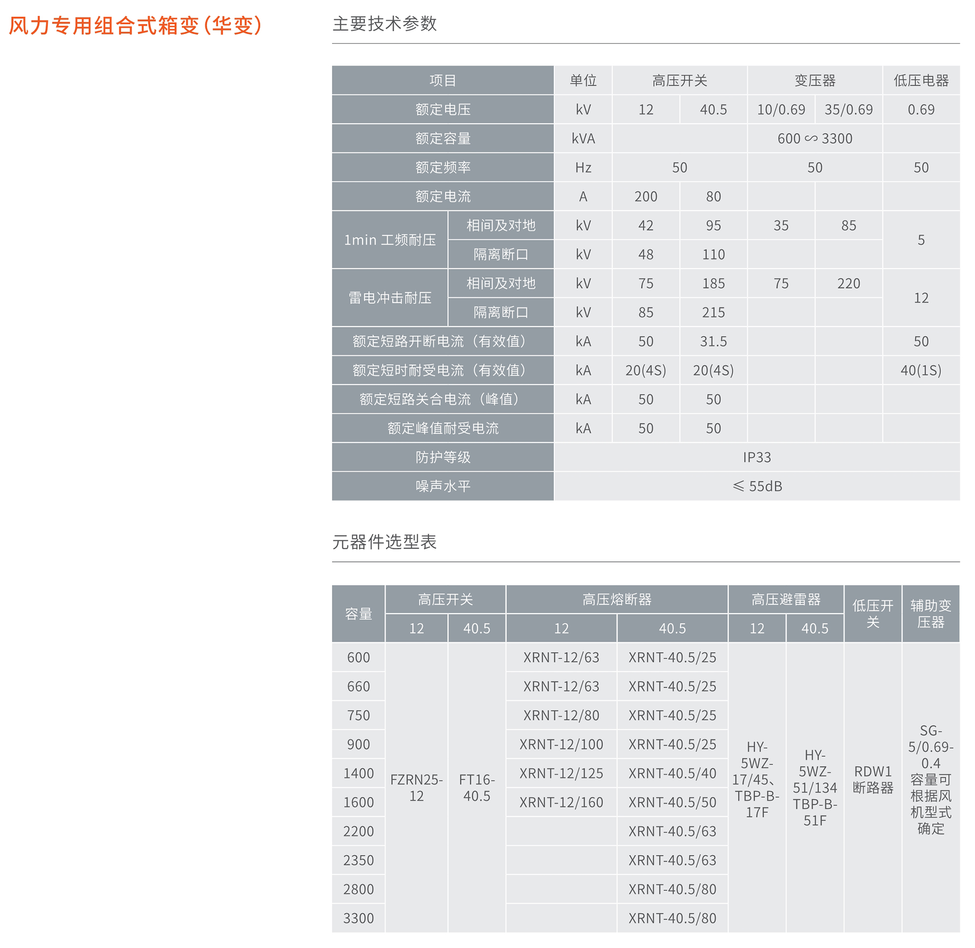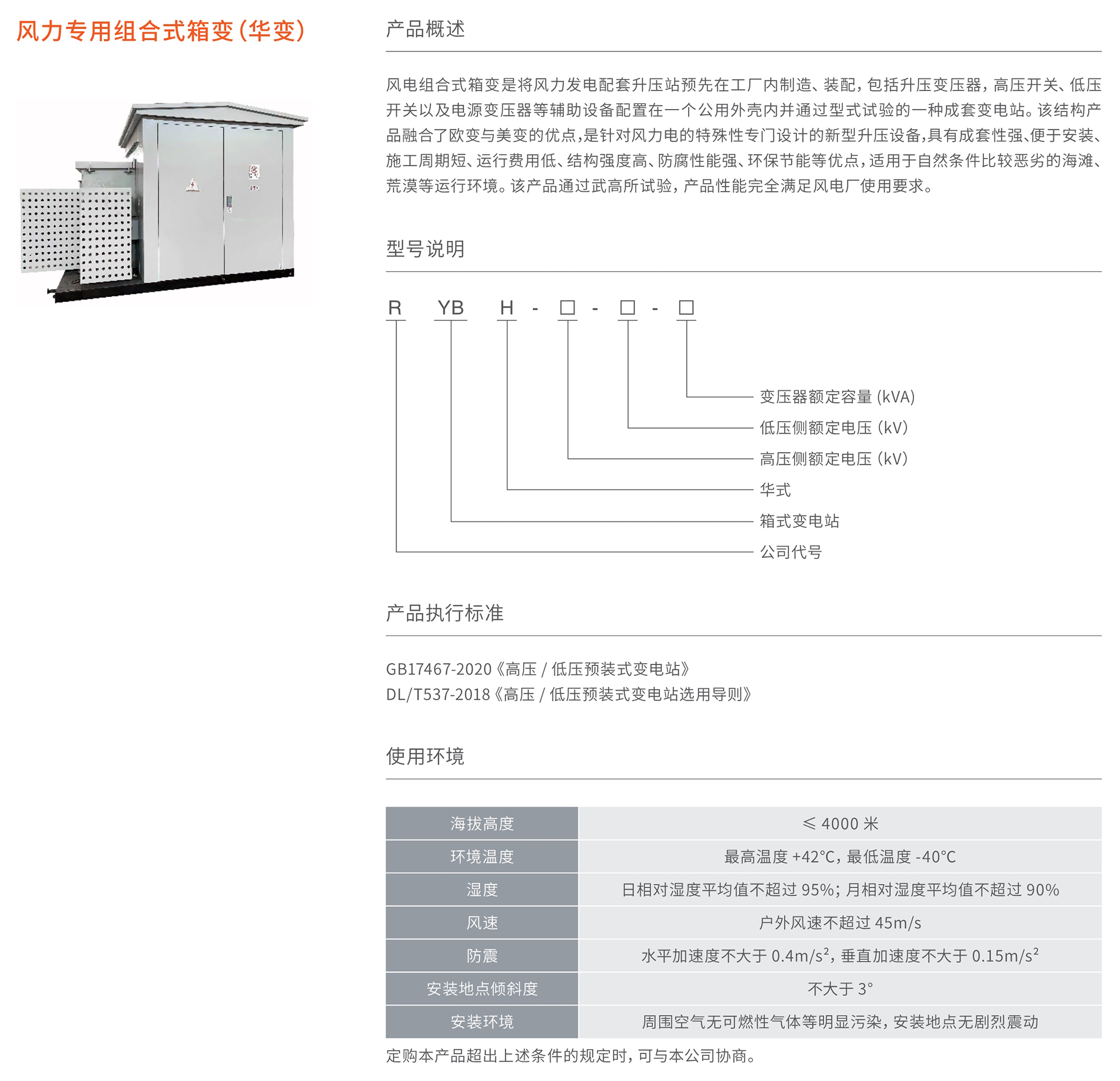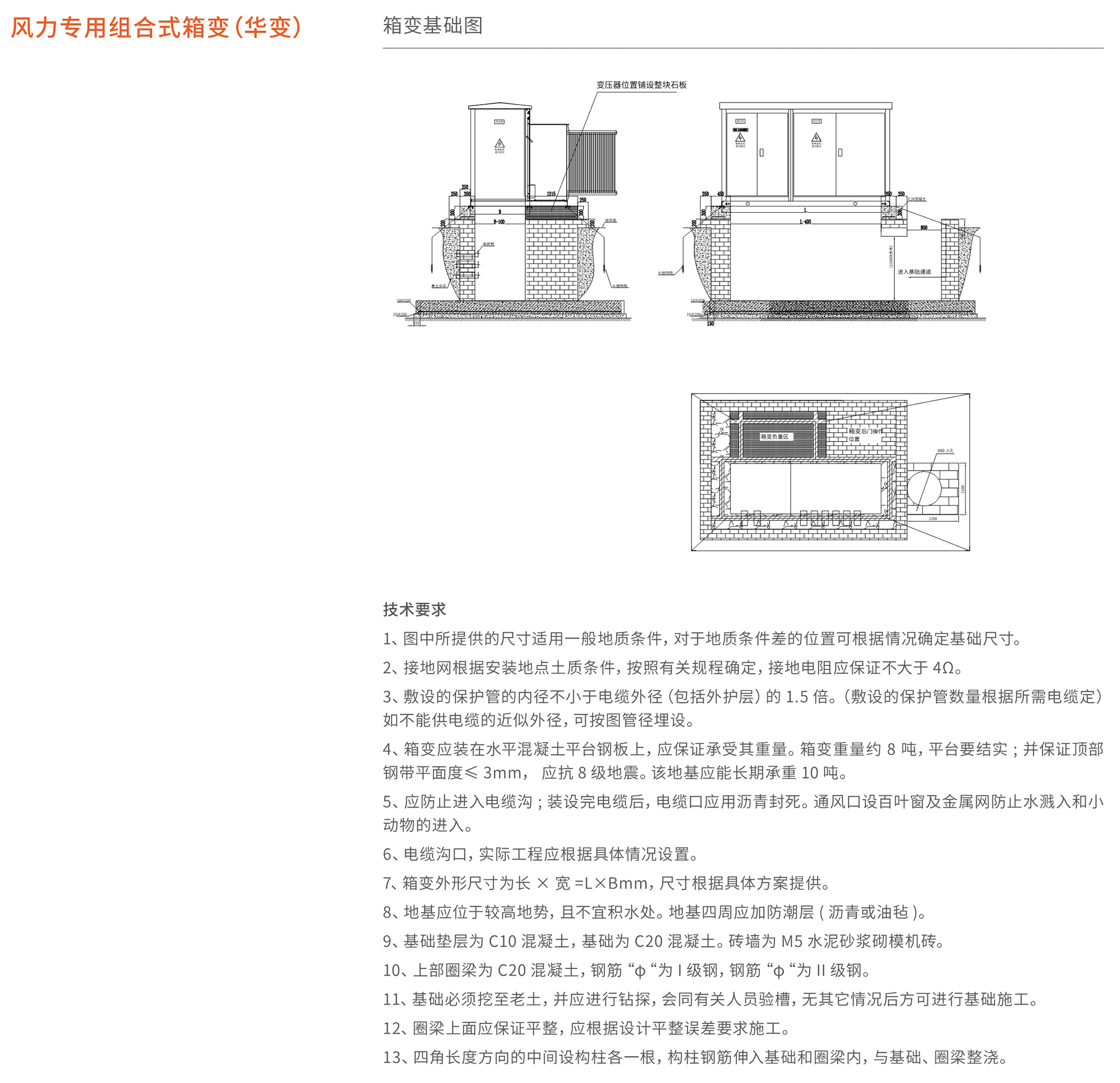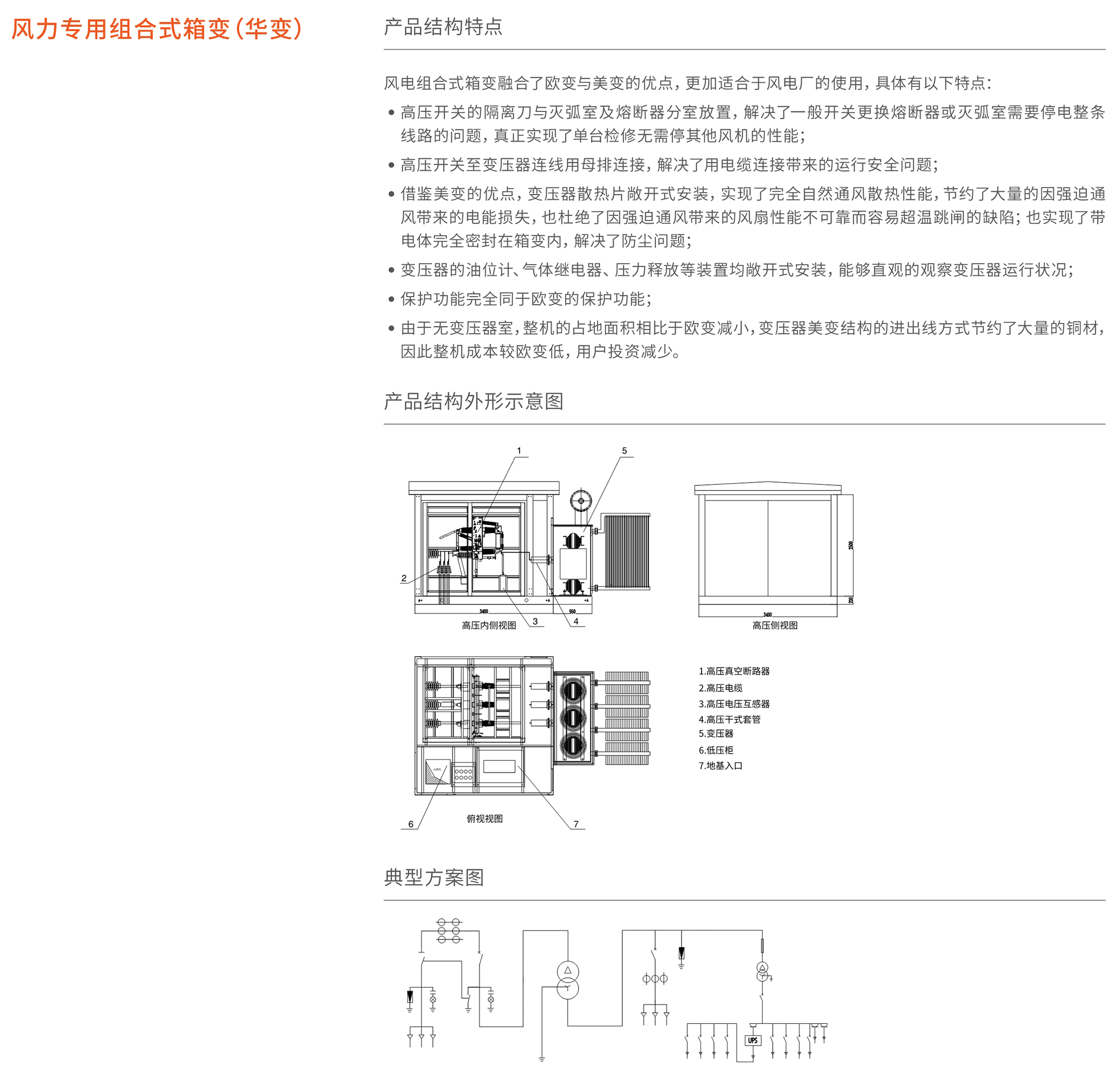 风电组合式箱变是将风力发电配套升压站预先在工厂内制造、装配,包括升压变压器,高压开关、低压开关以及电源变压器等辅助设备配置在一个公用外壳内并通过型式试验的一种成套变电站。该结构产品融合了欧变与美变的优点,是针对风力电的特殊性专门设计的新型升压设备,具有成套性强、便于安装、施工周期短、运行费用低、结构强度高、防腐性能强、环保节能等优点,适用于自然条件比较恶劣的海滩、荒漠等运行环境。该产品通过武高所试验,产品性能完全满足风电厂使用要求。