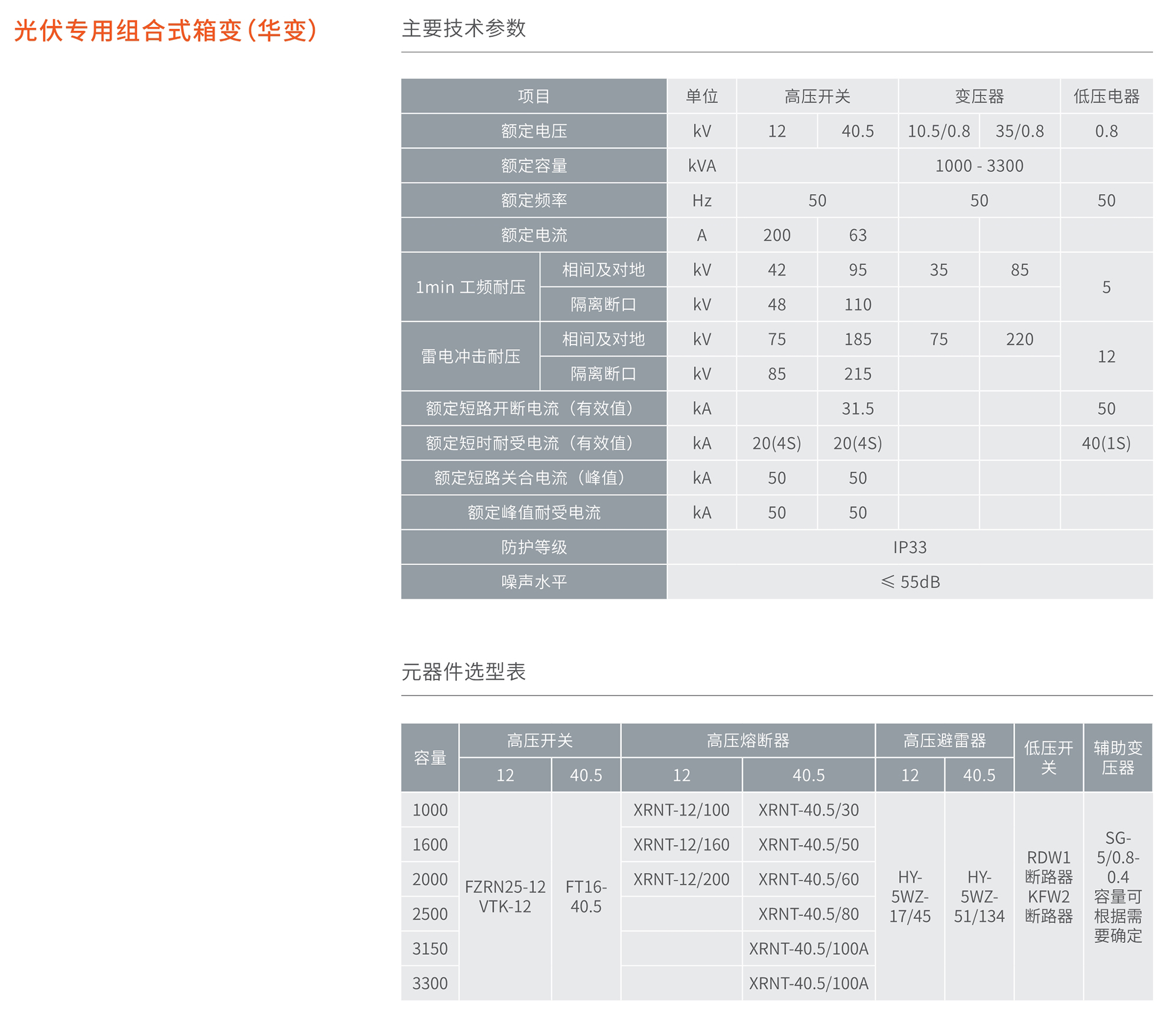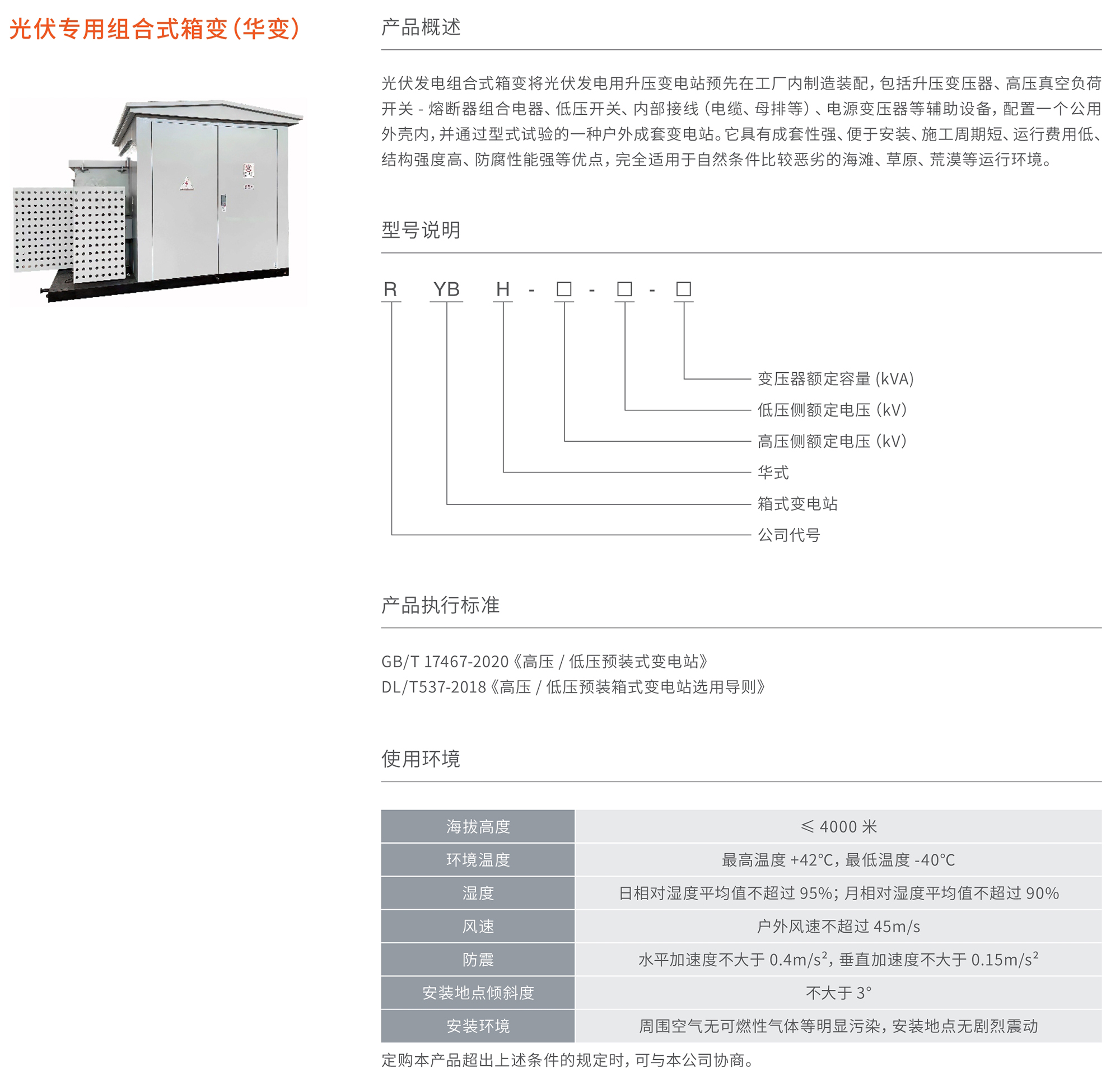 光伏发电组合式箱变将光伏发电用升压变电站预先在工厂内制造装配,包括升压变压器、高压真空负荷开关–熔断器组合电器、低压开关、内部接线(电缆、母排等)、电源变压器等辅助设备,配置一个公用外壳内,并通过型式试验的一种户外成套变电站。它具有成套性强、便于安装、施工周期短、运行费用低、结构强度高、防腐性能强等优点,完全适用于自然条件比较恶劣的海滩、草原、荒漠等运行环境。