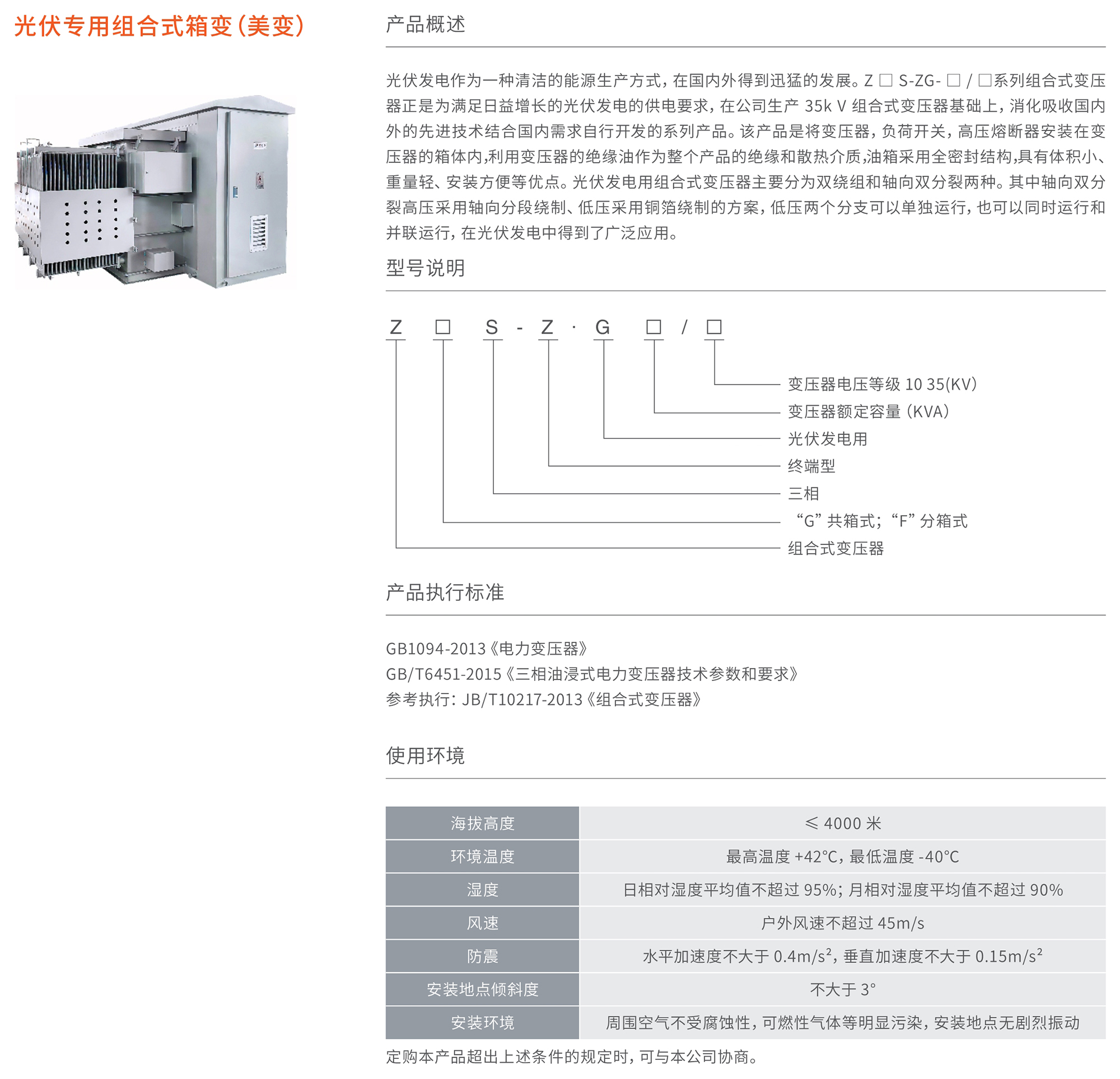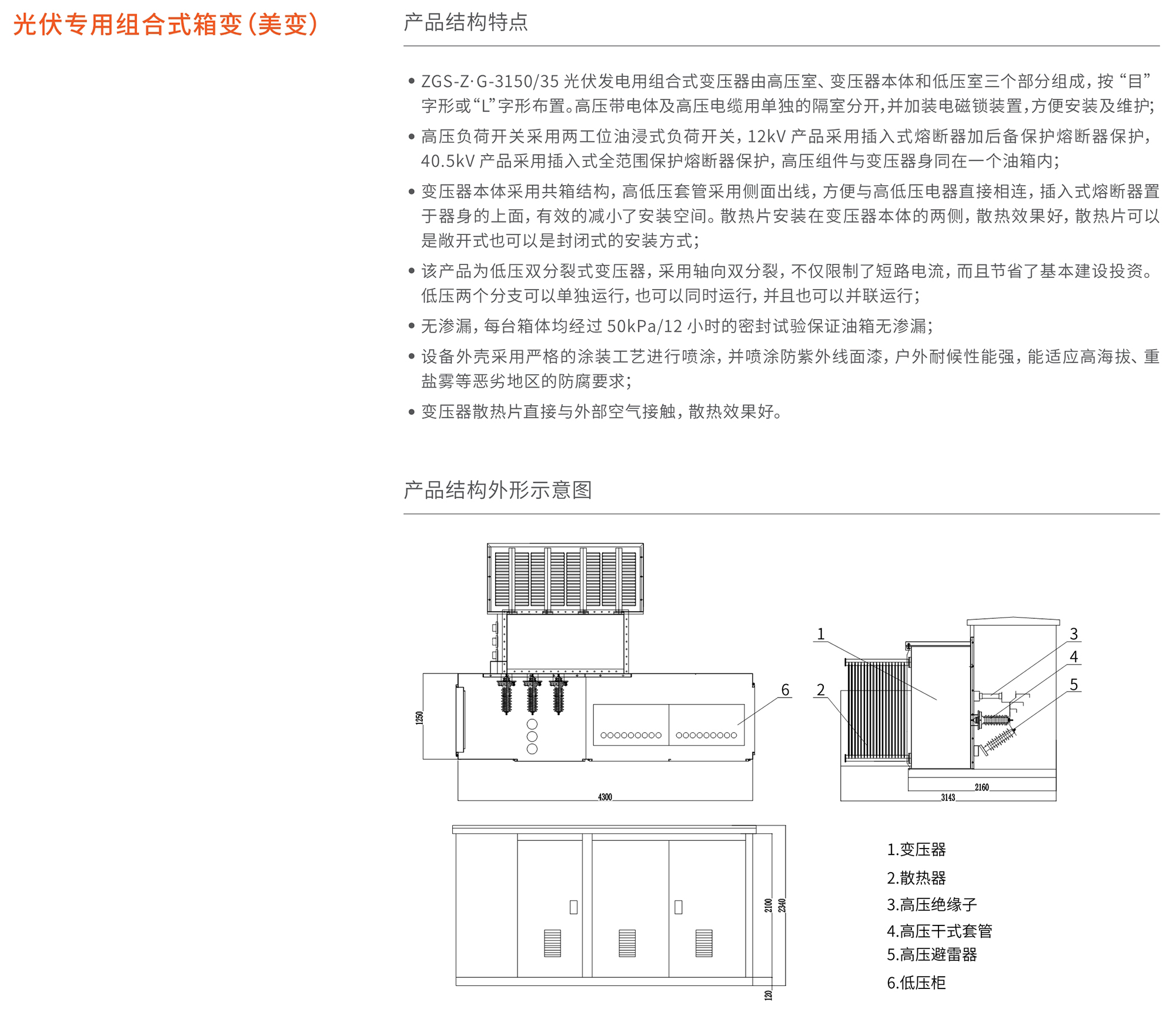 光伏发电作为一种清洁的能源生产方式,在国内外得到迅猛的发展。Z□S-ZG-□/□系列组合式变压器正是为满足日益增长的光伏发电的供电要求,在公司生产35kV组合式变压器基础上,消化吸收国内外的先进技术结合国内需求自行开发的系列产品。该产品是将变压器,负荷开关,高压熔断器安装在变压器的箱体内,利用变压器的绝缘油作为整个产品的绝缘和散热介质,油箱采用全密封结构,具有体积小、重量轻、安装方便等优点。光伏发电用组合式变压器主要分为双绕组和轴向双分裂两种。其中轴向双分裂高压采用轴向分段绕制、低压采...
