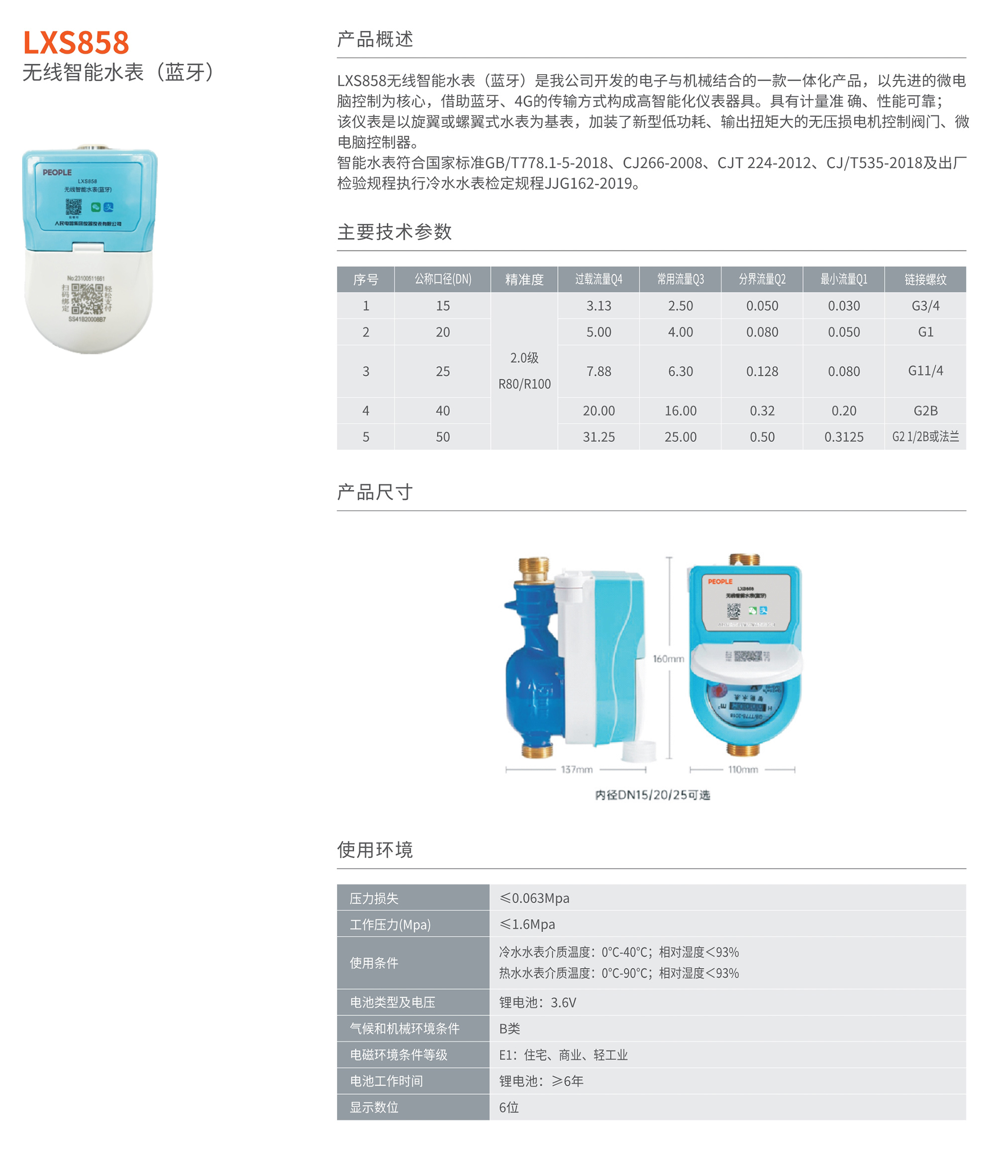 LXS858无线智能水表(蓝牙)是我公司开发的电子与机械结合的一款一体化产品,以先进的微电脑控制为核心,借助蓝牙、4G的传输方式构成高智能化仪表器具。具有计量准 确、性能可靠;该仪表是以旋翼或螺翼式水表为基表,加装了新型低功耗、输出扭矩大的无压损电机控制阀门、微电脑控制器。