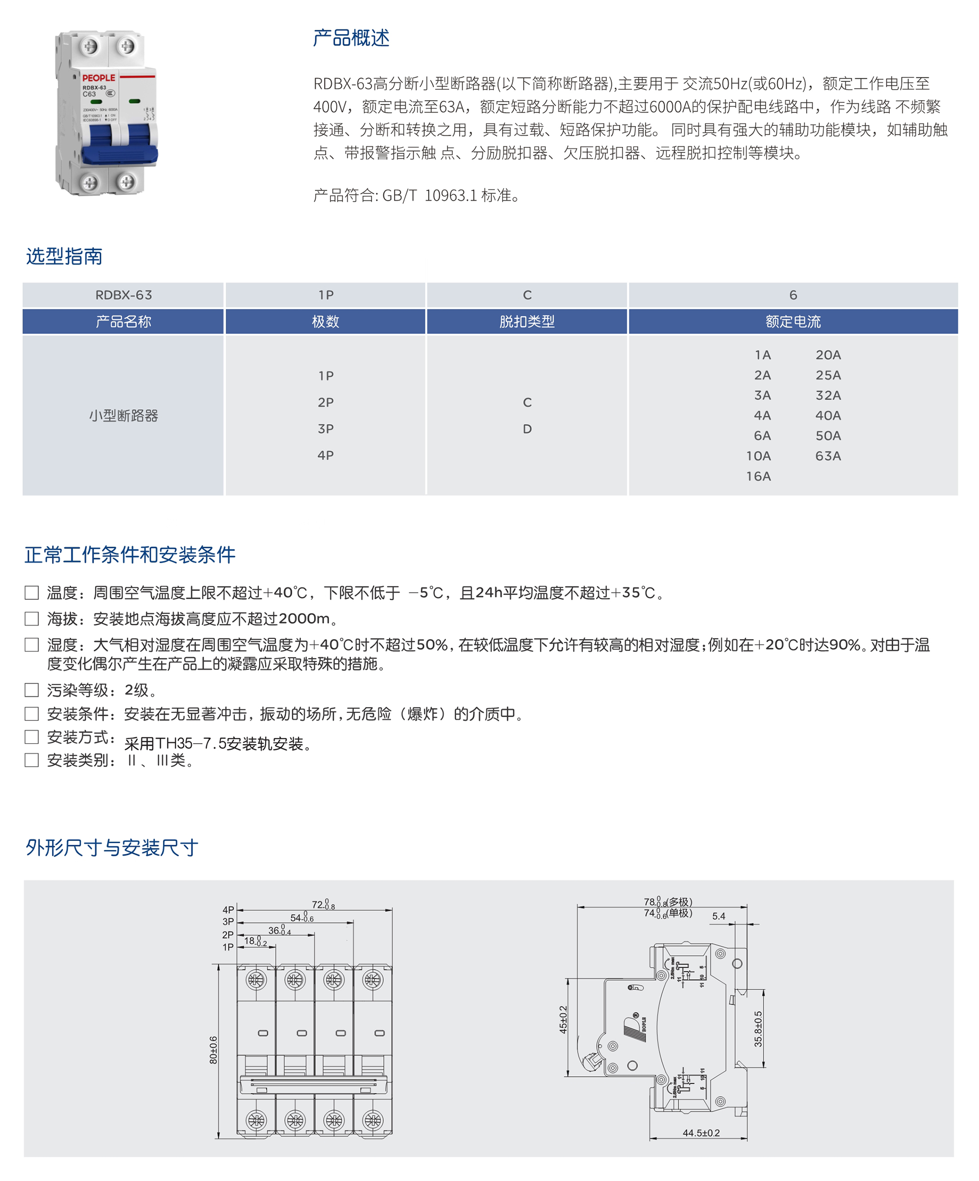 RDBX-63高分断小型断路器(以下简称断路器),主要用于 交流50Hz(或60Hz),额定工作电压至400V,额定电流至63A,额定短路分断能力不超过6000A的?;づ涞缦呗分?,作为线路 不频繁接通、分断和转换之用,具有过载、短路?;すδ堋?同时具有强大的辅助功能???,如辅助触点、带报警指示触 点、分励脱扣器、欠压脱扣器、远程脱扣控制等???。