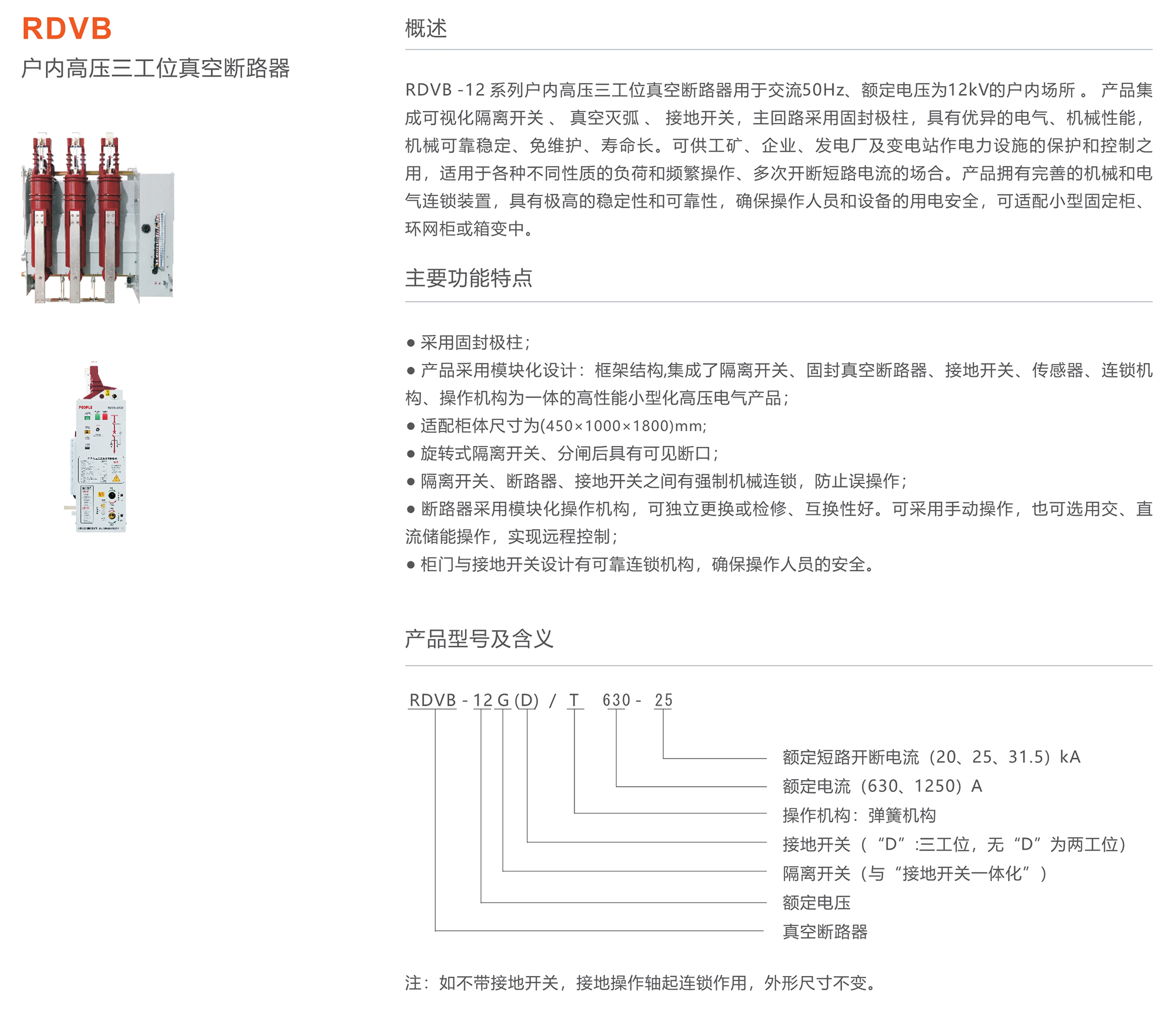 RDVB -12系列户内高压三工位真空断路器用于交流50Hz、额定电压为12kV的户内场所。产品集成可视化隔离开关、真空灭弧、接地开关,主回路采用固封极柱,具有优异的电气、机械性能,机械可靠稳定、免维护、寿命长??晒┕た?、企业、发电厂及变电站作电力设施的?;ず涂刂浦?,适用于各种不同性质的负荷和频繁操作、多次开断短路电流的场合。产品拥有完善的机械和电气连锁装置,具有极高的稳定性和可靠性,确保操作人员和设备的用电安全,可适配小型固定柜、环网柜或箱变中。