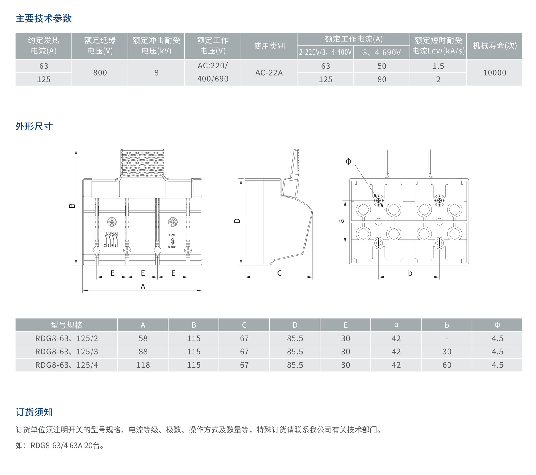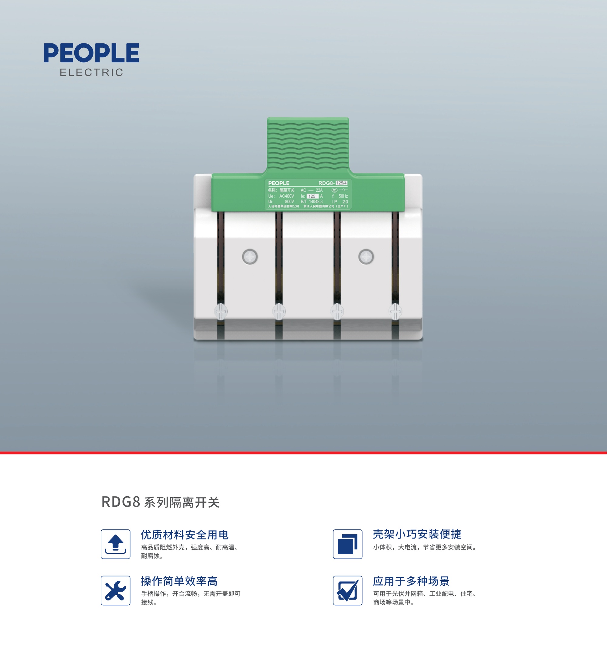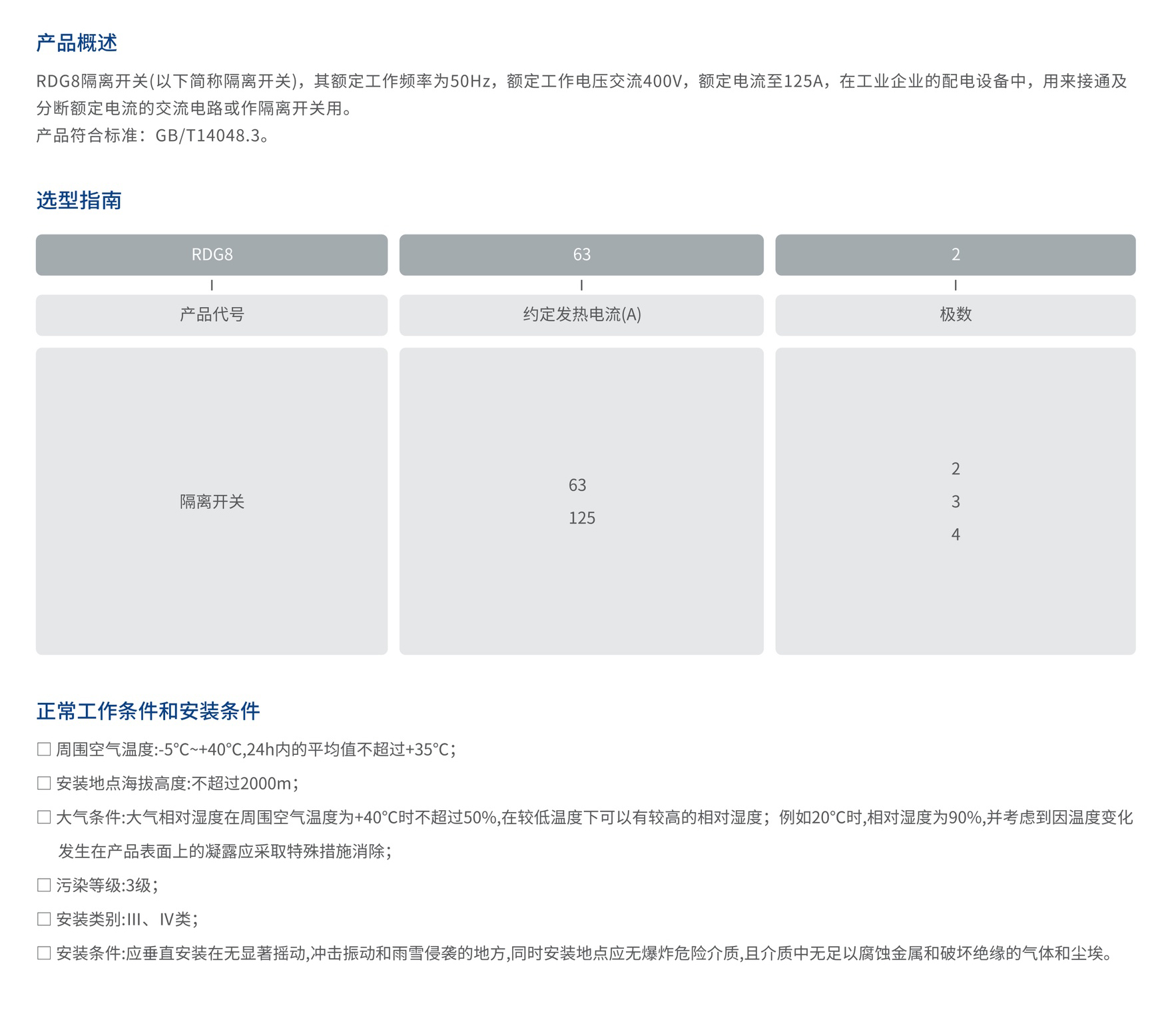 RDG8隔离开关(以下简称隔离开关),其额定工作频率为50Hz,额定工作电压交流400V,额定电流至125A,在工业企业的配电设备中,用来接通及分断额定电流的交流电路或作隔离开关用。