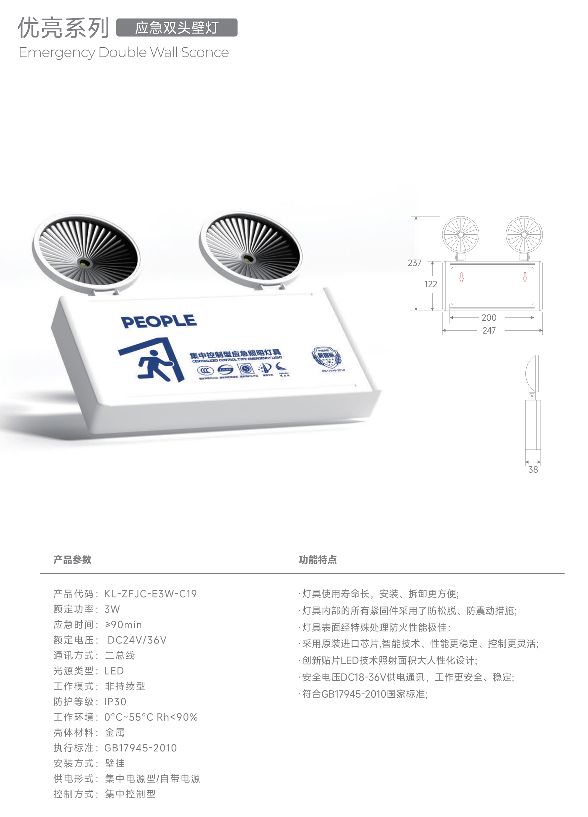 应急双头壁灯 KL-ZFJC-E3W-C19