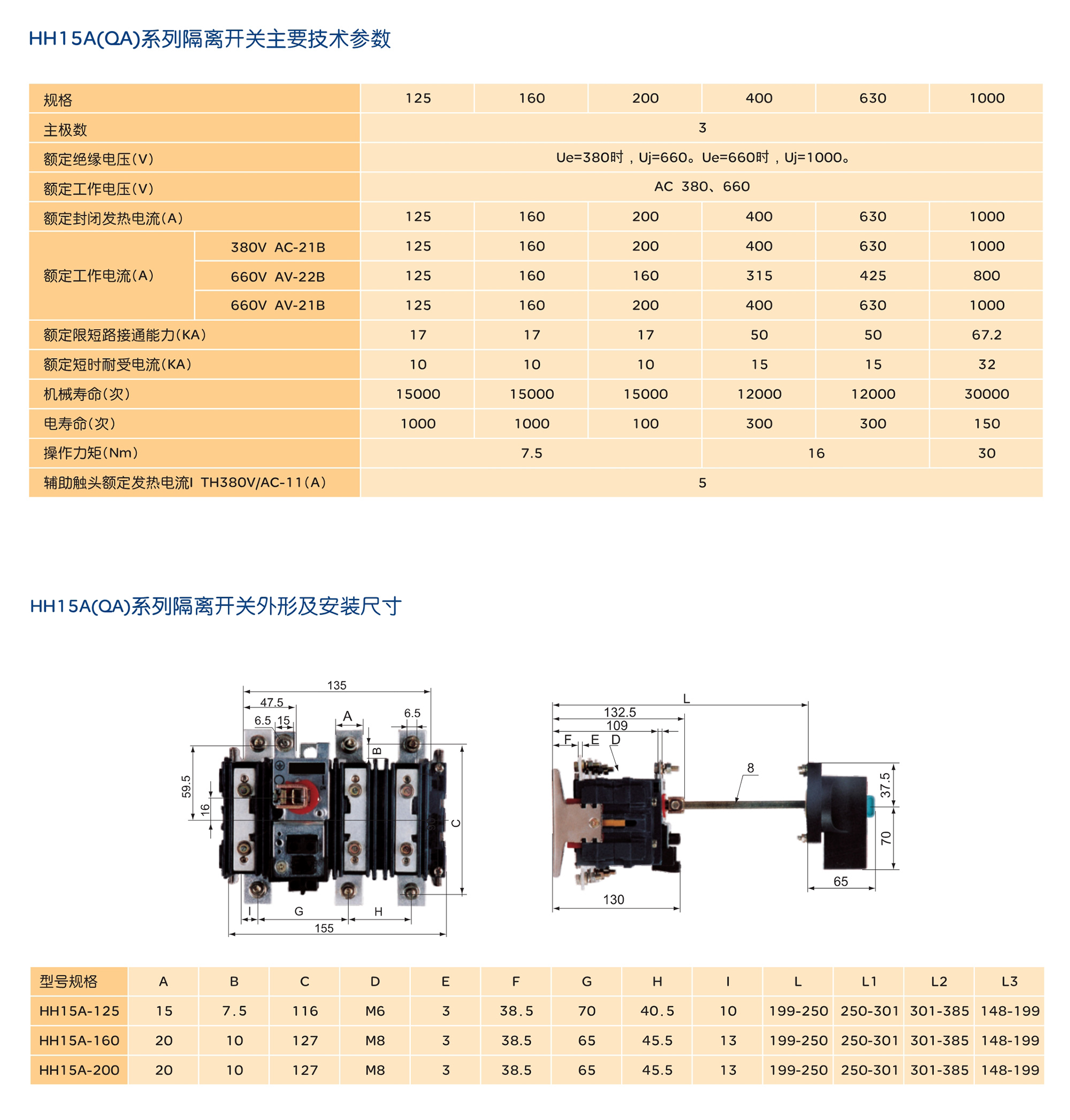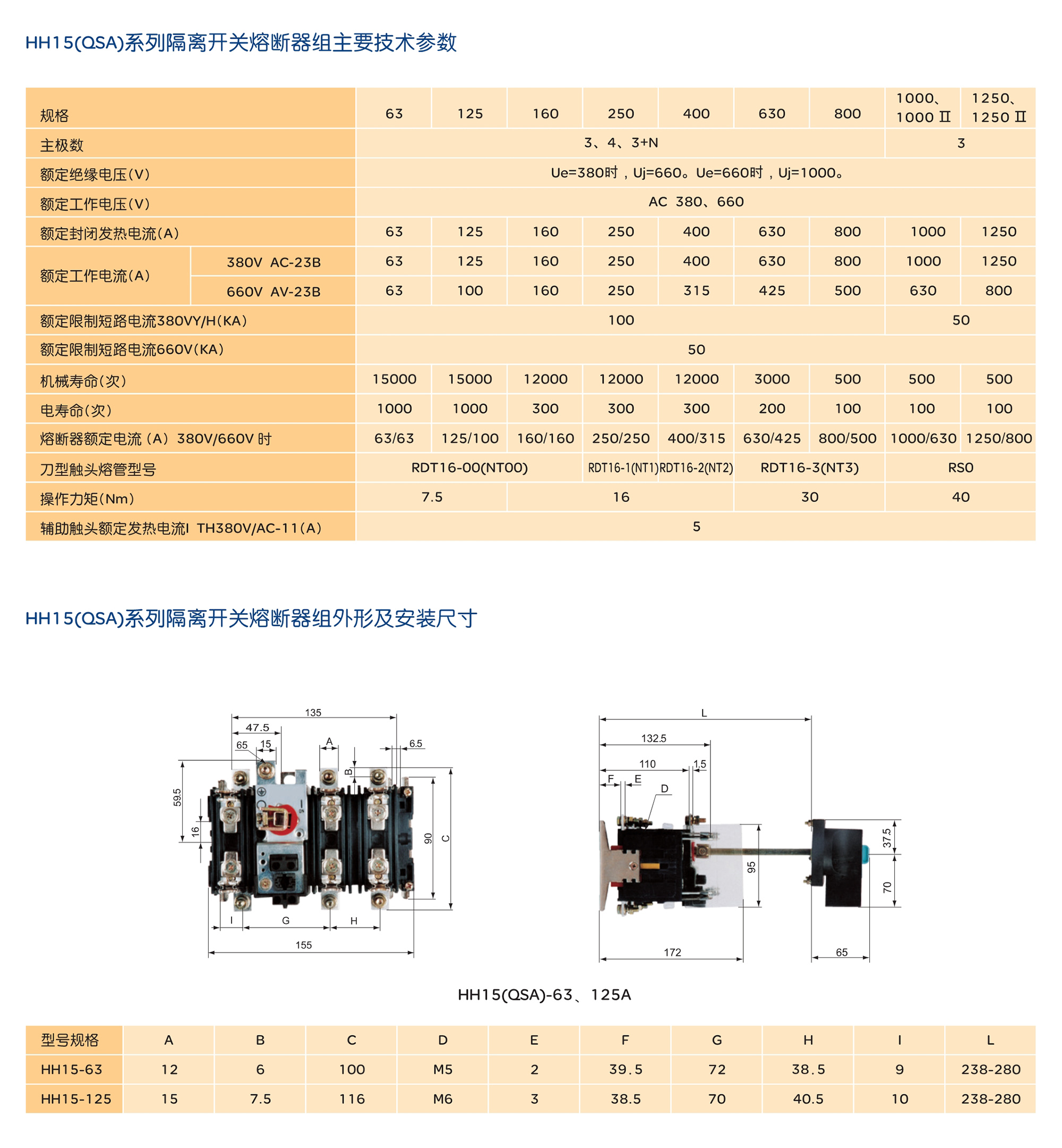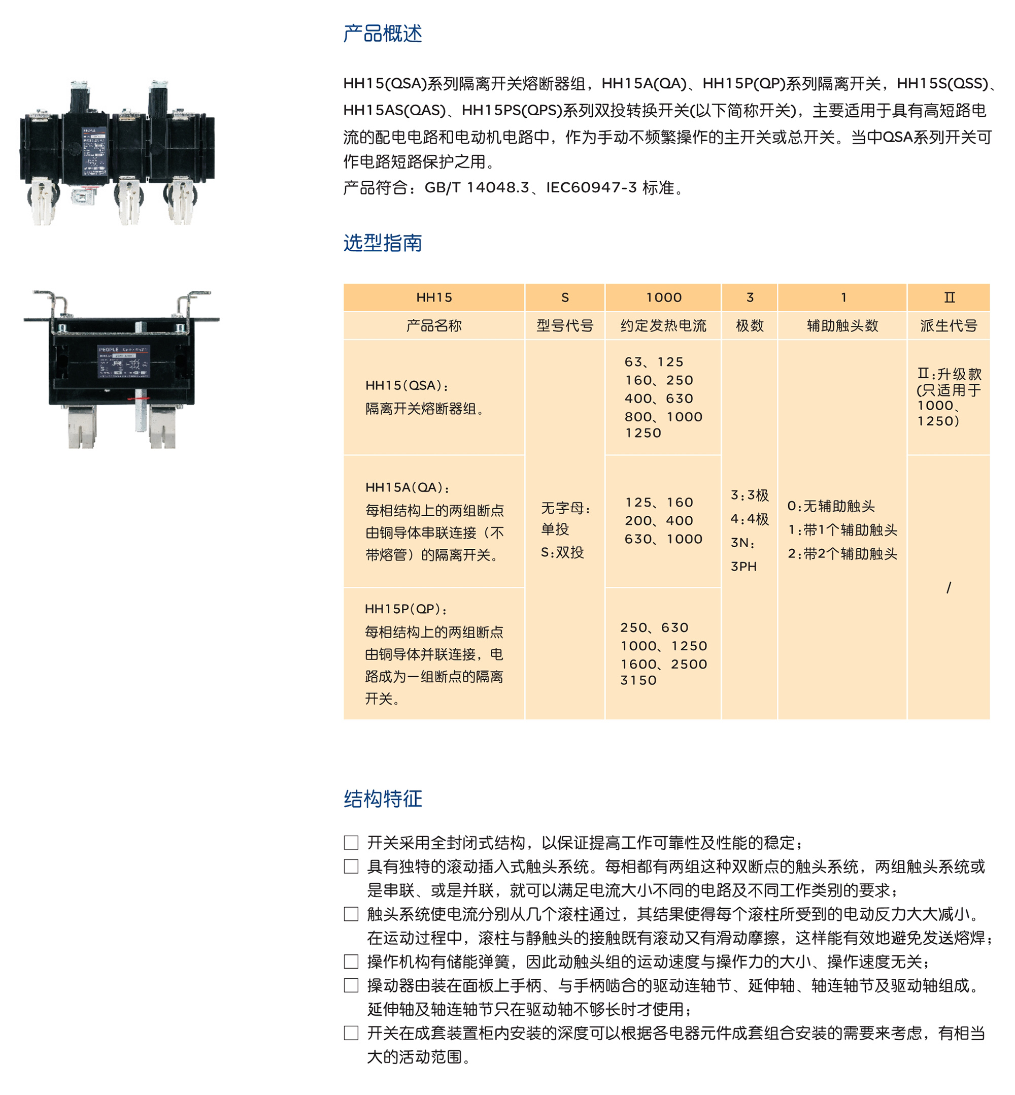 HH15(QSA)系列隔离开关熔断器组,HH15A(QA)、HH15P(QP)系列隔离开关,HH15S(QSS)、HH15AS(QAS)、HH15PS(QPS)系列双投转换开关 以下简称开关 ,主要适用于具有高短路电流的配电电路和电动机电路中,作为手动不频繁操作的主开关或总开关。当中QSA系列开关可作电路短路?;ぶ?。
