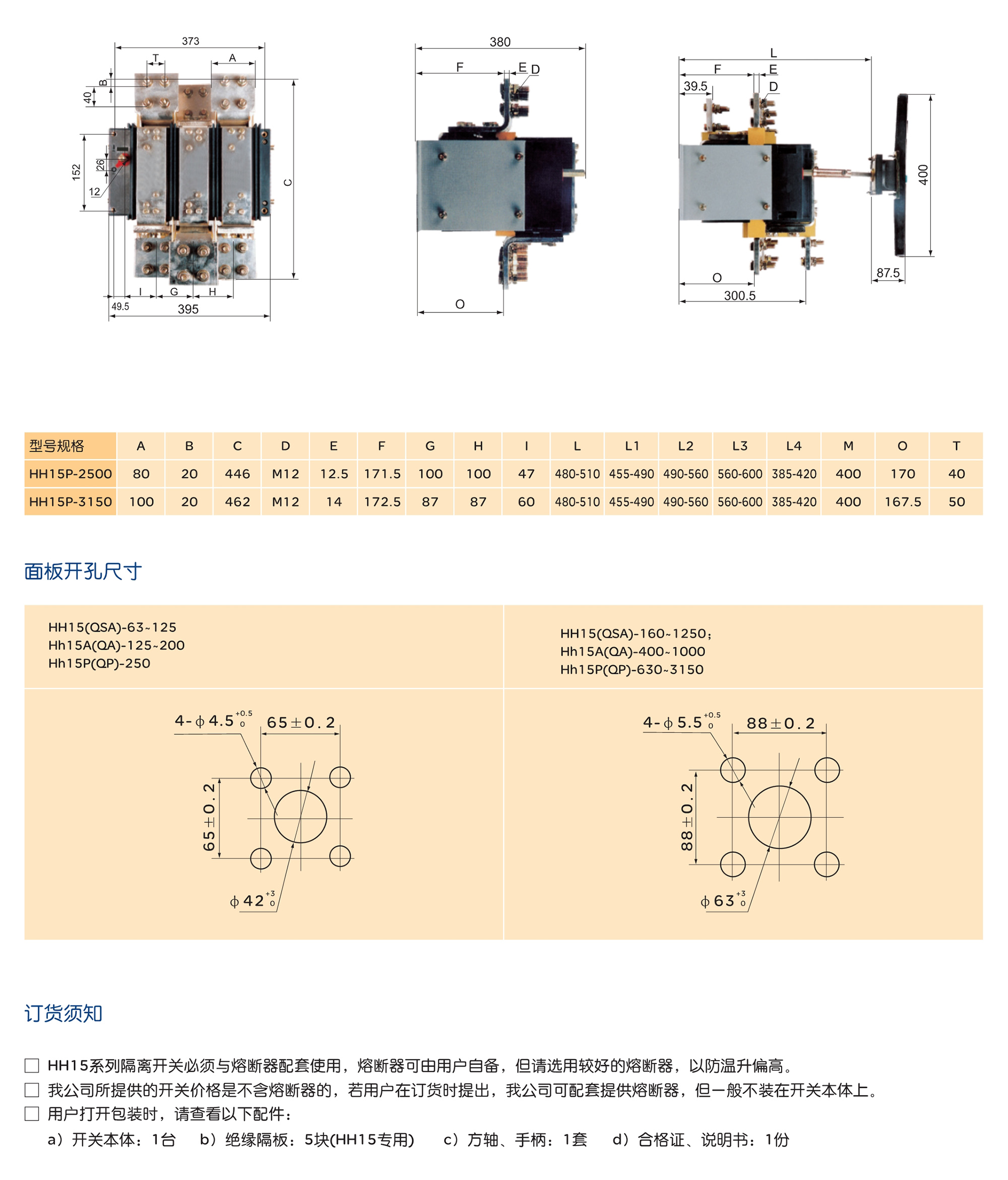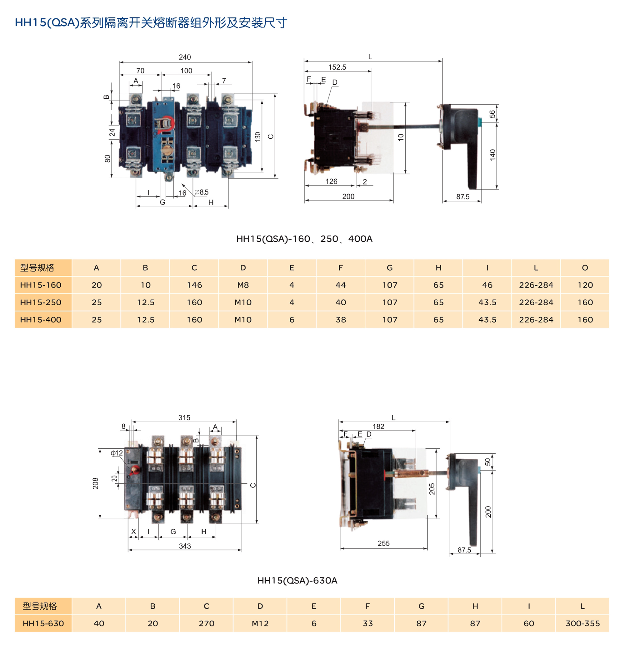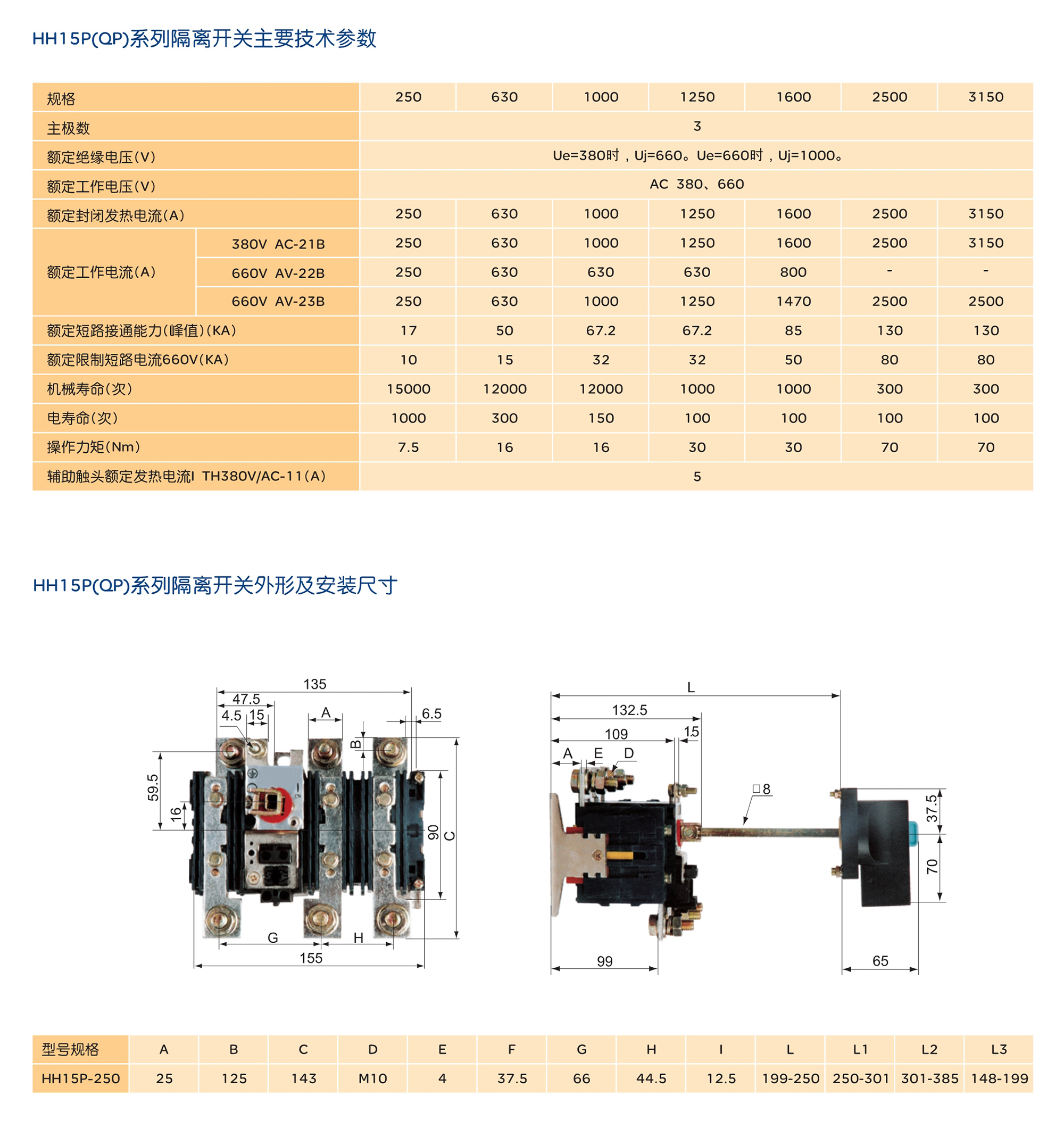 HH15(QSA)系列隔离开关熔断器组,HH15A(QA)、HH15P(QP)系列隔离开关,HH15S(QSS)、HH15AS(QAS)、HH15PS(QPS)系列双投转换开关 以下简称开关 ,主要适用于具有高短路电流的配电电路和电动机电路中,作为手动不频繁操作的主开关或总开关。当中QSA系列开关可作电路短路?;ぶ?。