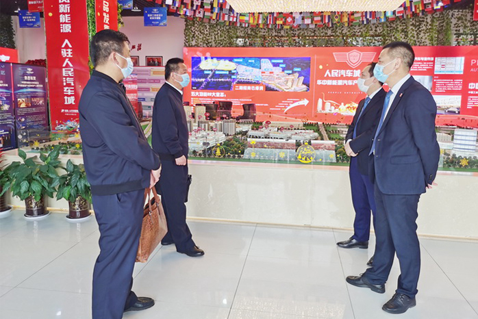 李坚一行先后参观了人民汽车城营销中心、汽车交易市场、蔡甸车管分所等地,并详细询问了现阶段企业复工复产情况。人民汽车城总经理刘志鹏就项目复工复产情况作详细汇报。