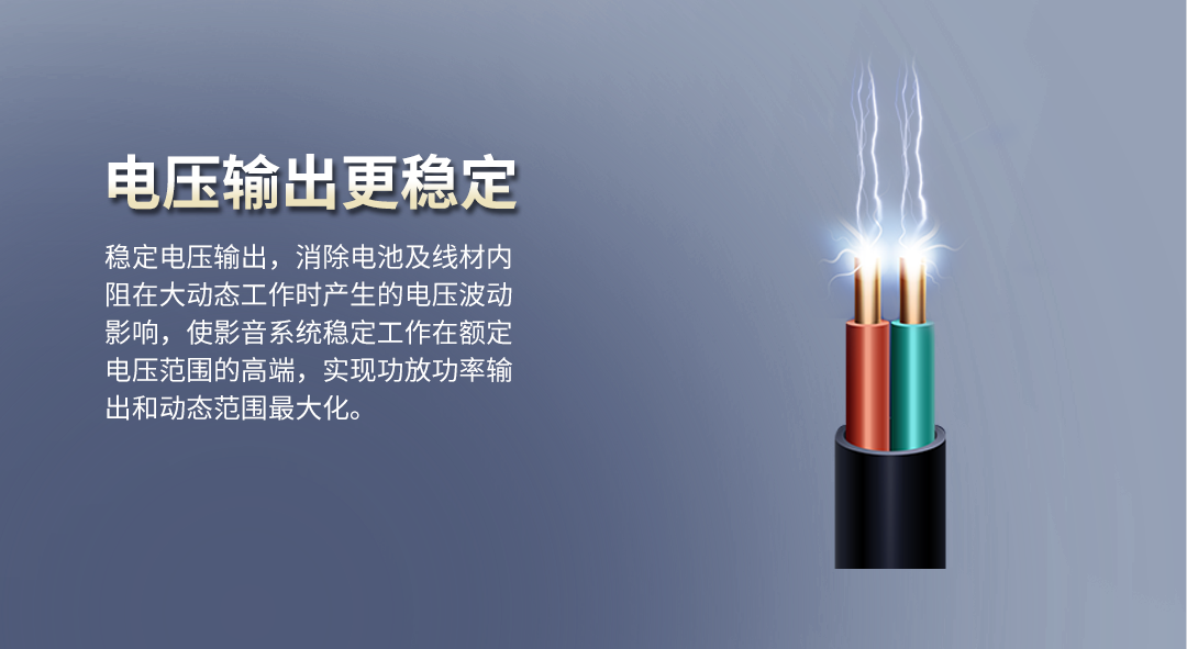 稳定电压输出,消除电池及线材内阻在大动态工作时产生的电压波动影响,使影音系统稳定工作在额定电压范围的高端,实现功放功率输出和动态范围最大化。