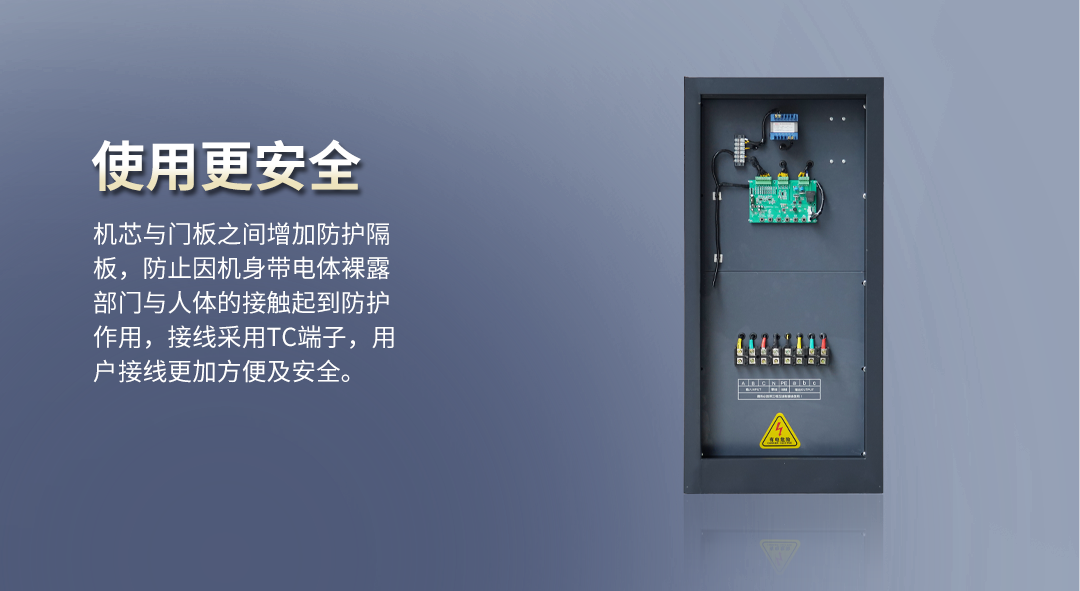 机芯与门板之间增加防护隔板,防止因机身带电体裸露部门与人体的接触起到防护作用,接线采用TC端子,用户接线更加方便及安全。