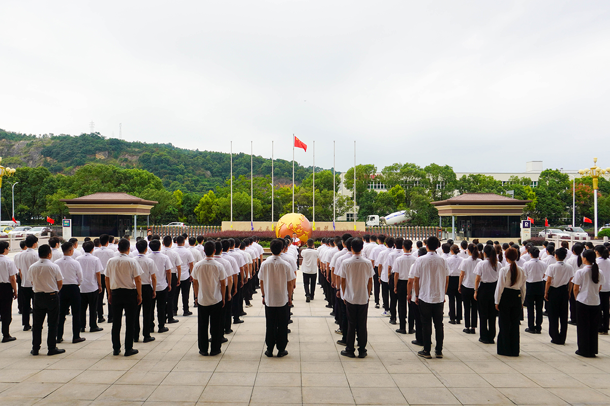 晨曦下,温州总部中高层领导及行政职工在广场上整齐列队,按照既定流程完成了会前整队和早读环节。随着激昂的国歌声响起,鲜艳的五星红旗缓缓升起,在蓝天白云的映衬下格外耀眼。这一刻,所有人心潮澎湃,共同见证了这一庄严而神圣的时刻。