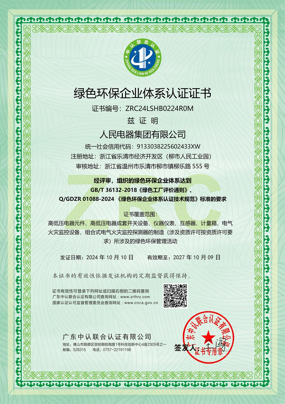 人民电器荣获绿色环保企业体系认证 引领行业绿色发展