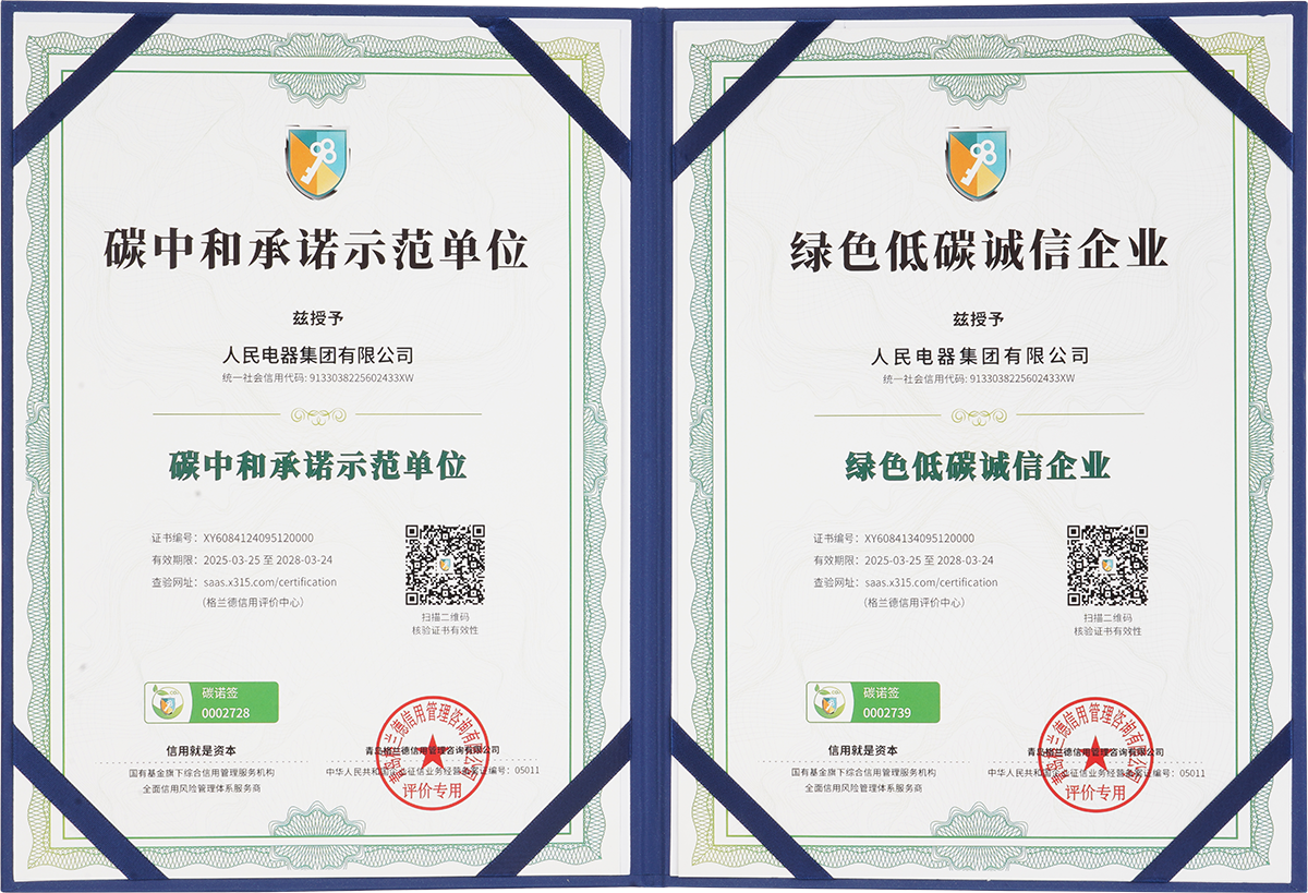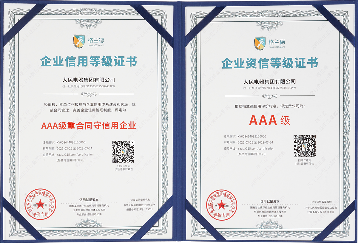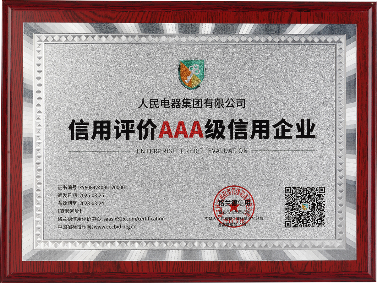 此次认证由格兰德信用评价中心颁发。该机构是经中国人民银行首批备案的第三方信用服务机构,拥有15年专业信用管理经验,评价体系涵盖企业履约能力、社会信誉、绿色低碳实践等多维度指标。其认证结果广泛应用于招投标、融资等领域,具有高度权威性和公信力。人民电器获此殊荣,既是对过往诚信成果的肯定,也为其在“双碳”目标下的绿色发展注入新动能。