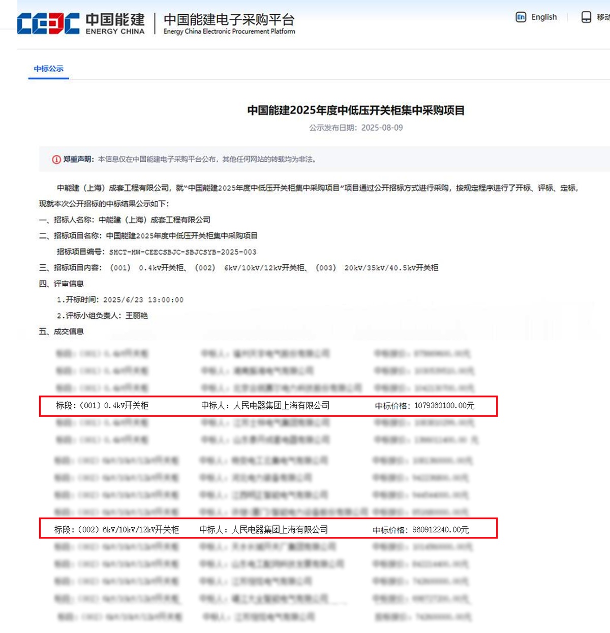 近日,中国能源建设集团(以下简称“中国能建”)在其官方采购平台公示“中国能建2025年度中低压开关柜集中采购项目”中标名单,中国·人民电器集团上海公司凭借卓越的技术实力,成功中标0.4kV及6kV/10kV/12kV开关柜标段,标志着集团在电力装备领域的竞争力再获权威认可。