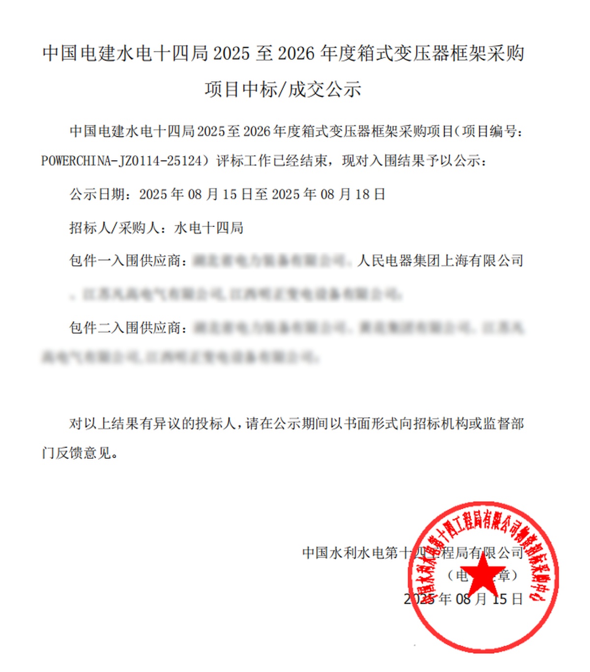 近日,中国电建集中采购平台公示了中国电建水电十四局2025至2026年度箱式变压器框架采购项目的中标/成交结果。中国·人民电器集团上海公司凭借卓越的产品质量、完善的资质认证及强大的综合实力,成功入围该项目包件一的供应商名单,彰显了集团在电力设备领域的综合竞争力。